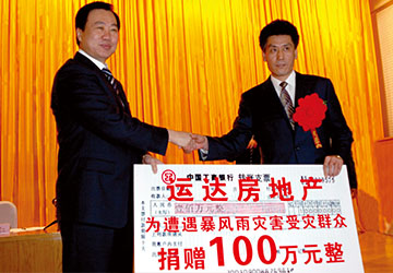 2007年,元宵節(jié)的一場(chǎng)大風(fēng)及暴雪讓大連損失慘重,同樣受災(zāi)的運(yùn)達(dá)仍積極捐款100萬。在隨后的“關(guān)愛濱城慈善月”中運(yùn)達(dá)再次捐出300萬元現(xiàn)金,獲得市政府領(lǐng)導(dǎo)的高度贊揚(yáng);